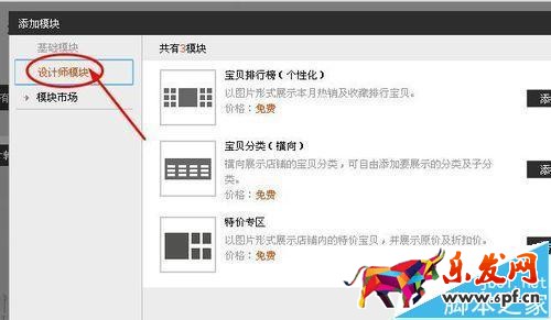 5、如果使用的是購買的模板,就切換到,設計師模塊,找到自己需要的模塊,添加。方法同上。添加完成,就可以開始編輯。