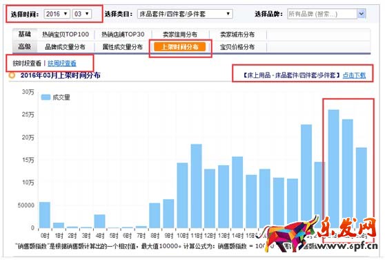 我擦,這玩意兒還要配合!當然需要,說過很多次,店鋪做的好不好,其實都是一個又一個的細節堆積到一起的,這一點我做到了,你沒有做,至少在這個得分上,我就取得了領先。。我們假設一下,你準備重點優化的關鍵詞,根據店鋪的實際情況,準備是:長袖連衣裙。路徑:生e經——行業分析——我的情報——情報助手——選擇好類目——寶貝按人氣前200排序——填好關鍵字——選擇好你準備競爭的價格區間——點擊上架時間分布,看下圖:哎呀,我去!這數據太牛逼了吧!是的,太牛逼了!(注:截圖都是截了一半兒,不完全,然后數據可以下載!)