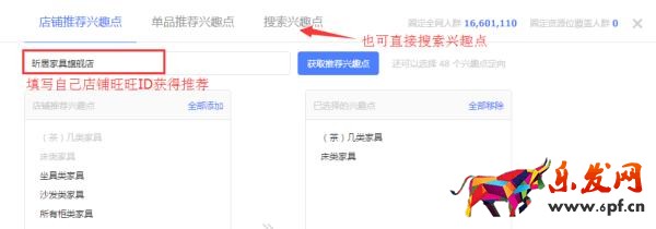 可以輸入某個店鋪旺旺來獲取相應(yīng)興趣點,一般輸入自己的店鋪旺旺即可!也可以直接直接搜索關(guān)鍵詞,添加相應(yīng)的興趣點。