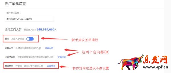①填寫推廣單元名稱、選擇定向:定向都是自主可選,不是每個定向都必須要設(shè)置!新手建議先關(guān)閉通投、群體,先設(shè)置最為精準(zhǔn)的訪客定向。