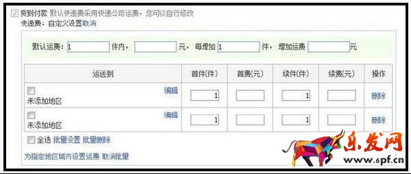 出現下圖,此處設置方法同運費模板上半部分的快遞運費一致,只是您設置的運費金額是貨到付款的。