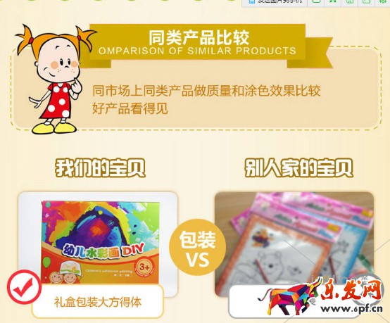 還有要注意的就是咱們的寶貝詳情頁的問題,掌柜詳情頁做的還是比較好的。詳情頁把咱們的優惠信息再次傳遞給客戶,還有寶貝的細節問題。還有水彩畫的分類也做得很好。也和其他家的做了一個對比的。還要從咱們的詳情頁跳出率、流量、轉化率看咱們的寶貝適不適合推廣。