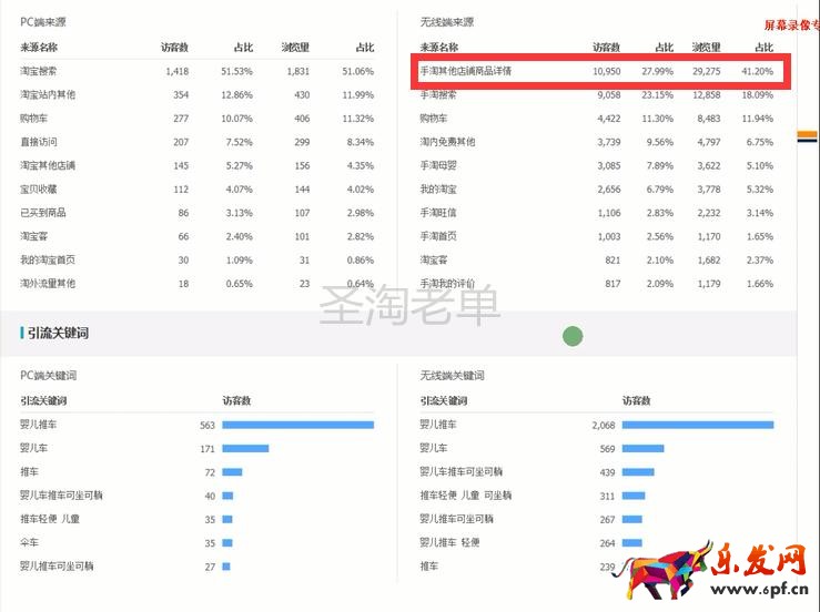 再來看流量來源,PC跟無線相比,PC端的流量只要1000多,更多的流量來自無線端,而且是無線端的“手淘其他店鋪商品詳情”,這就是流量的根源。