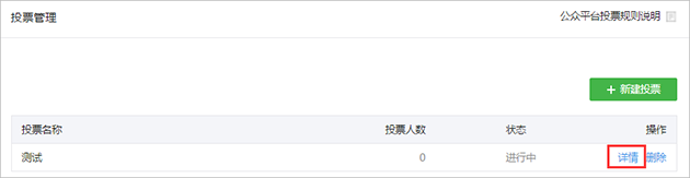 您可通過公眾平臺=》功能=》投票管理=》查看對應(yīng)投票標題=》點擊詳情即可。