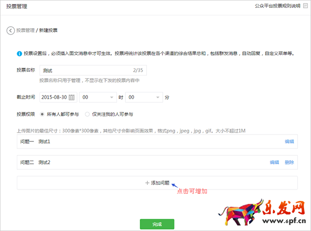4、投票最多可設(shè)置10個問題、每個問題最多設(shè)置30個選項;