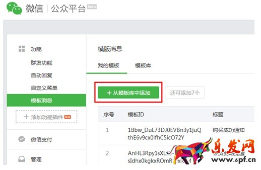 已開通模板消息的服務(wù)號在公眾平臺“功能”菜單欄里可直接看到“模板消息”選項,點擊后即可進入模板消息界面。公眾號運營者首先需要選擇帳號服務(wù)所處的兩個行業(yè),進而點擊“+從模板庫中添加”按鈕即可從模板庫中選擇這兩個行業(yè)的模板進行服務(wù)通知。