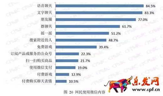 最后,微信朋友圈的使用頻次。相關(guān)數(shù)據(jù)顯示,網(wǎng)民在微信上使用較多的內(nèi)容分別為文字聊天、語音聊天,二者使用比例均在80%以上,而使用朋友圈的比例也高達(dá) 77%。另外,張小龍在去年12月微信公開課上也提到了一個數(shù)據(jù),“訂閱號有非常多的閱讀量來自朋友圈,這符合2/8分布原理,20%的用戶到訂閱號里面 去挑選內(nèi)容,而后80%的用戶在朋友圈里去閱讀這些內(nèi)容。”微信朋友圈的使用頻次顯而易見。