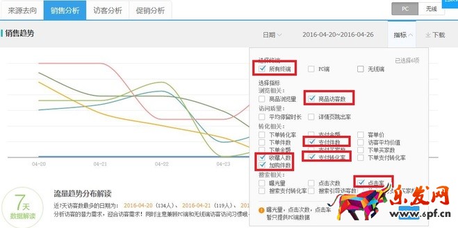 我們?cè)谏鈪⒅\的單品分析里面,可以看到你關(guān)注寶貝的一些數(shù)據(jù)。然后把這些數(shù)據(jù)做一些總結(jié)。首先是我們要選取我們需要的項(xiàng)目,(生意參謀--專題工具--單品分析--銷售分析)如下圖: