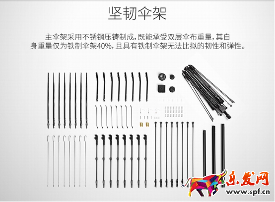 而競爭對手確實這種的表現方式是這種,通過零件分開,顯得更專業,其實加入一句話說,假設變成是由385個零件組合而成的堅韌傘架,這樣會更加牛逼,感覺不一樣的感覺。