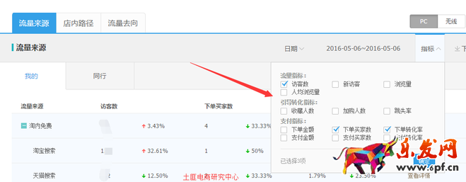 另外是大家要利用好這個功能,這個是我們土匪電商研究中心常用的,因為功能實在非常強大。因為他分日期,我可以把每天的數據記錄,之后對比,另外指標可以選擇,里面我們可以選擇訪客數、新訪客、瀏覽量、人均瀏覽量、收藏人數、加購人數、跳失率、下單金額、下單買家數、下單轉化率、支付金額、支付買家數、支付轉化率。