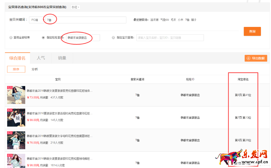 分析對手的引流詞、豆腐塊詞、寶貝排名等。如下圖,可快速查詢韓都衣舍旗艦店“T恤”這個詞寶貝排名。然后對比自己店鋪的寶貝排名,優(yōu)化關鍵詞。