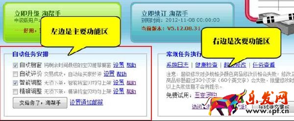 其中主功能區(qū)包含“自動(dòng)櫥窗、自動(dòng)評(píng)價(jià)、智能調(diào)整和精確調(diào)整”四項(xiàng)功能。各項(xiàng)前面有“復(fù)選框”,后面有“設(shè)置”“幫助”鏈接。下面有一個(gè)按鈕——“交給你了,淘幫手”。各項(xiàng)功能有“打開”“關(guān)閉”“設(shè)置”三種操作: