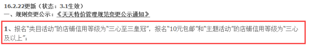 3.報名店鋪信譽更改:由原來的“三星到五鉆”更改為“三星到三皇冠”,給到賣家更多的報名機會。