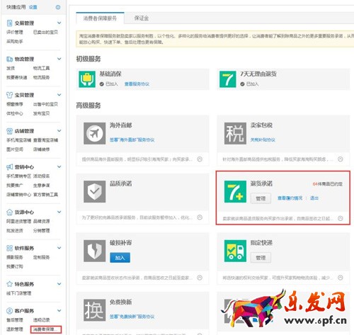 交完消保,順帶把運(yùn)費(fèi)險(xiǎn)都給開通了。等有發(fā)布了寶貝后,再回來添加7+。