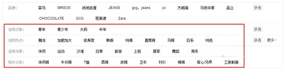 這是在正式搜索結果展示的上方出現的。為什么要出現這個呢(當然關鍵詞搜索也會出現,這是一樣的)?因為你點擊“單肩包”的時候,搜索引擎只知道你想要一個單肩包,但是你到底要一個什么樣子的單肩包(也就是更具體的屬性),它并不知道,那么搜索引擎為了給用戶更好地搜索體驗,他就先把可能會影響你購買的重要屬性值羅列出來,供你進行深度篩選。比如流行款式、質地、風格等等。這一切的一切,都是為了良好的用戶購物體驗。