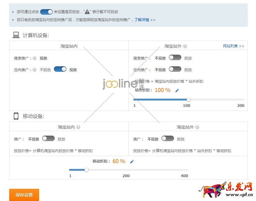 對于像家具類的大物件基本上成交情況肯定是PC端好的,雖然移動購物是趨勢,但是瀏覽并不等同于下單,這與這種客單價高,購買一次需要慎重,退換貨物不方便的寶貝來說,手機端只會是瀏覽,最多是加購收藏,下單一般都會在電腦端上多看詳情頁,所以我們一般把移動端折扣調(diào)到60%到70%,看掌柜具體怎么給日限額,有的掌柜就是要求用最少的花費帶來最大的投產(chǎn),那就要舍棄花費大,轉(zhuǎn)化小的部分。