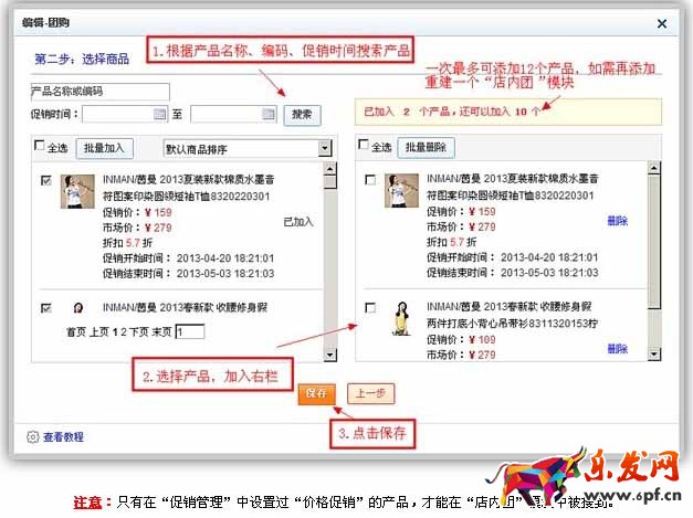 注意:只要在“促銷管理”中設(shè)置過“價格促銷”的產(chǎn)品,才能在“店內(nèi)團”模塊中被搜到。