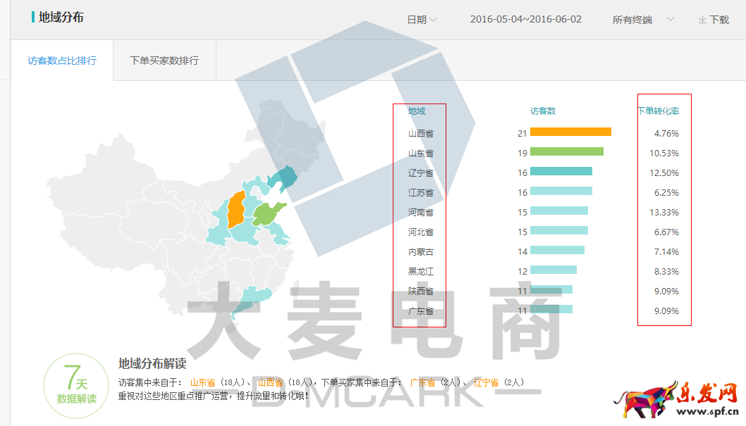 3.地域設置,偏類目可能會有些地域的購買性不強的,那么我們可以在生意參謀后臺看我們店鋪最近30天下單訪客的地域要進行篩選設置,也可以在直通車報表-地域報表里面把一些效果較差的地域給剔除。