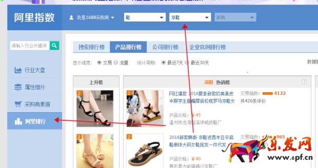 知道什么產品后,我們就要去找產品了,怎么找呢,直接進入阿里搜索,比如搜索:涼鞋女,然后銷量排名,再結合剛找出的款式屬性,就可以發現本身熱賣,屬性又符合我們需求的產品了。