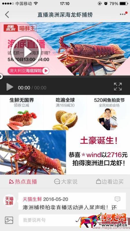 讓鏡頭潛入海底,屏幕上環繞著各種水草和海底生物,還有一只只肥美的大龍蝦游來游去。用戶就捧著手機,眼睜睜看著它們從海底被捕撈上岸。前不久,天貓喵鮮生就做了這么一場澳洲海底捕龍蝦的直播。