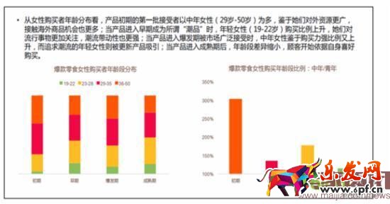 從女性購買者年齡分布來看,產品初期的第一批接受者以29到50歲這一年齡段為多,因為他們的對外資源要更為廣泛,接觸海外商品的機會也比較多;當產品進入早起成為所謂的潮品的時候哦,年輕女性購買比例上升,他們對流行事物更加的關注;當產品進入爆發期被廣泛接受的時候,中年女性的購買比例又會大幅度上升