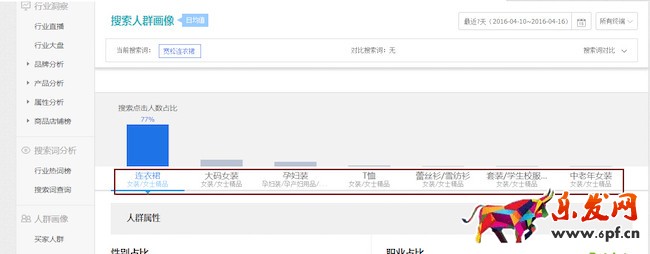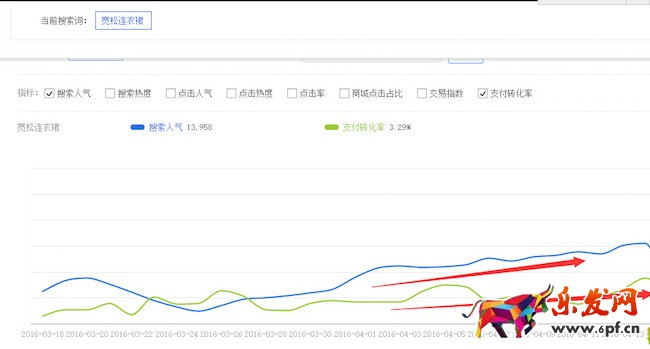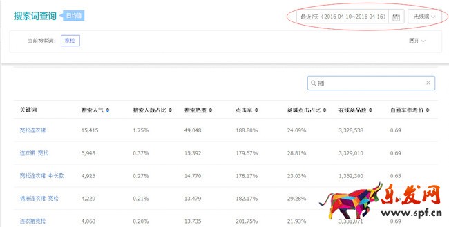 下面以“寬松連衣裙”這個核心詞分析為例子:1.從最近七天看,搜索人氣在持續增長,轉化率也有穩定上升的態勢。