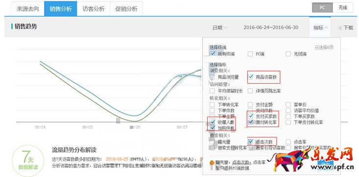 進入單品分析,選擇30天觀察寶貝走勢,著重關注商品訪客數,支付買家數,收藏人數,加購件數和支付轉化率,看完之后看7天的點擊情況。