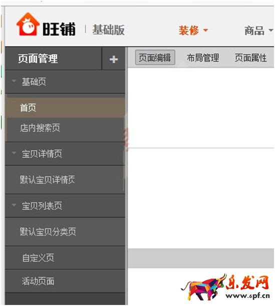 2012舊版旺鋪裝修后臺(tái)首頁(yè),頂部旺鋪標(biāo)志背景是灰色的,左側(cè)顯示的是頁(yè)面管理內(nèi)容,有基礎(chǔ)頁(yè)、首頁(yè)、店內(nèi)搜索頁(yè)、寶貝詳情頁(yè)等內(nèi)容。具體效果如下圖所示,就是舊版2012旺鋪。