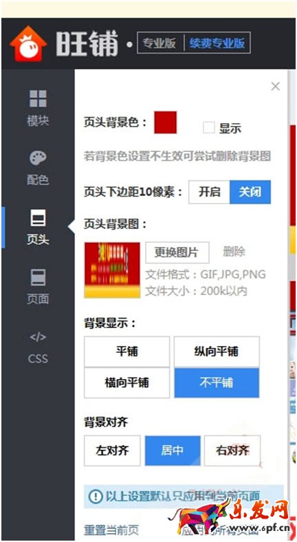 新旺鋪裝修后臺(tái),頂部的旺鋪標(biāo)志背景為黑色,左側(cè)顯示有模塊、配色、頁(yè)頭、頁(yè)面、css。如果你的裝修后臺(tái)如下圖一樣,那么就是新版旺鋪。