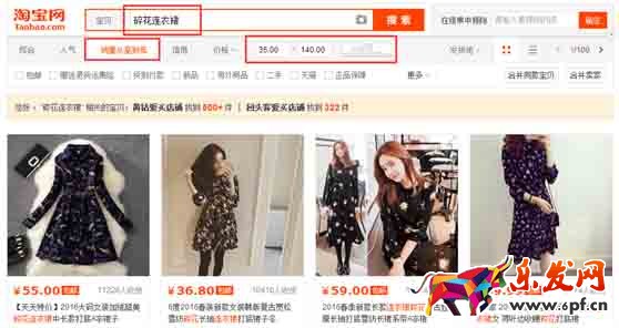 不同的目標人群,不同的商品,消費者關注的焦點就不一樣。根據上面的分析結果,碎花連衣裙,價格定位在35——140之間,我們看一下,打開淘寶,搜索框里面輸入“碎花連衣裙”,價格卡在35——140之間,然后按照銷量排行,找銷量最好的: