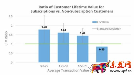 為暢銷產(chǎn)品設(shè)置訂閱模式,不僅可以吸引新買家,還能夠提高顧客終身價值(顧客終身價值,指的是每個購買者在未來可能為企業(yè)帶來的收益總和)。電商數(shù)據(jù)分析公司Compass分別調(diào)查了采用“訂閱模式”和“單次購買模式”的網(wǎng)上賣家,發(fā)現(xiàn)平均訂單價值低于25美元的網(wǎng)店,如果采取訂閱模式,顧客終身價值可提高1.78%。有趣的是,平均訂單價值越高,“訂閱模式”對顧客終身價值的提升就越小。