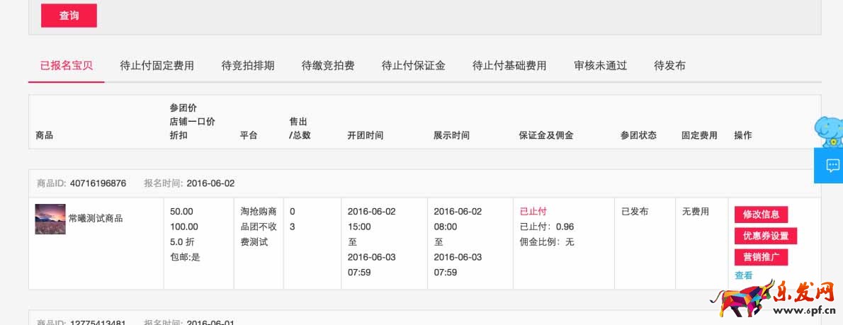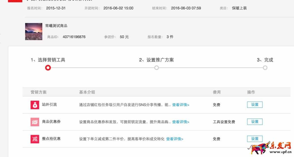 1、在淘搶購后臺找到待開團的商品,點擊“營銷推廣”按鈕進入營銷工具頁面,如下圖: