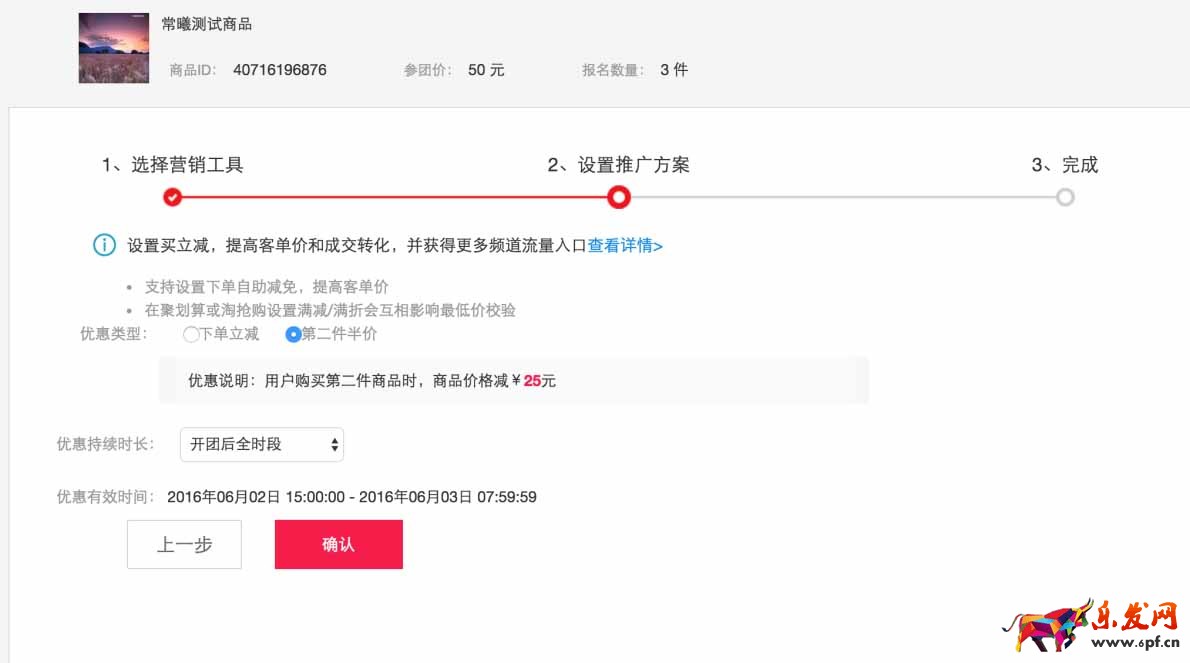 3、進入設置頁面,選擇優惠類型。目前支持“下單立減”和“第二件半價”兩種優惠。
