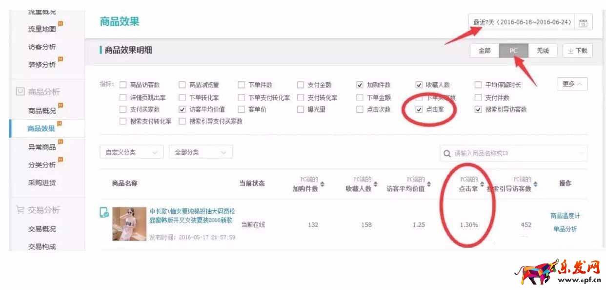大家看上面這幅圖,這家店最近7天PC端的點擊率只有1.30%,無線端點擊率達到了99.7%之高。在6月1號到6月7號這一周內,PC端點擊率僅有1.13%,搜索支付轉化率只有2.59%。同樣的在6月7號到6月14號的這個星期點擊率僅有1.21%,搜索支付轉化率只有2.71%。從這三組數據大家可以明顯的看出來點擊率的高低決定了搜索支付轉化率、下單轉化率、加購率以及收藏率,所以說點擊率才是關鍵。