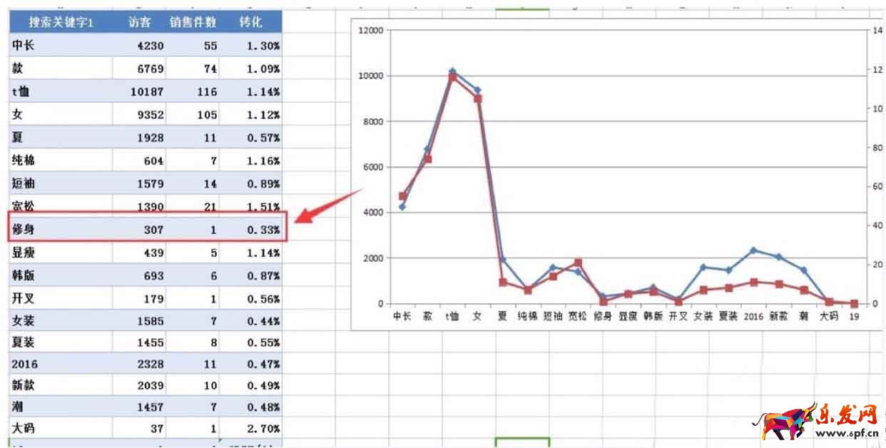 另一方面就是關鍵詞分析,這時候我們要分析的是競品關鍵詞在手淘流量搜索中訪客數、流量量、轉化率等,核心關鍵詞不同的寶貝不建議做為競品參考。以下圖數據為例,相同核心關鍵詞“寬松t恤女中長款”7天訪客數環比增長幅度7.27%,子訂單環比增長13.35%。