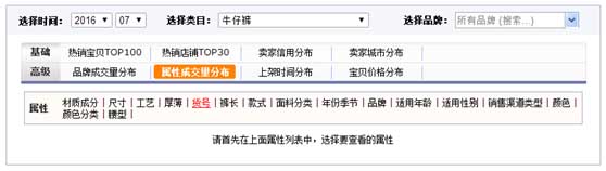 然后,我們可以用同樣的方式,把重要屬性的競爭力狀況計算出來,選擇最合適的可以切入的寶貝。我們僅舉兩個例子吧,找到女裝牛仔褲這個子類目,在生e經的“行業分析”當中: