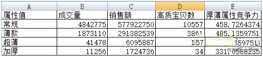 這是“褲長”和“厚薄”這兩個屬性的競爭力分析,我們可以看到在7月份的時候,薄款的短褲是競爭力最強的。當然你還應該去分析一下去年的數據狀況,綜合評價!截止到現在,我們在沒有分析風格等屬性的前提下,可以得出一個結論,如果你現在準備切入女裝類目:薄款的女短褲是你應該切入的。