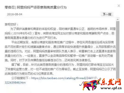 看到這條消息大家應該懂了,阿里對這種低價卡屏的方法已經找出對策來制止大家了,但是這條消息也不僅僅是直接針對所謂的“低價卡屏”惡意刷分,主要是針對利用色情低俗或與實際商品不符的圖片吸引誘騙消費者點擊,通過異常手段快速提升質量分,從而獲取額外流量的違規行為,還有其他的諸如利用軟件、好友互刷之類的等等,并沒有直接提到,但是鑒于今年阿里對**等違規行為的打擊力度,相信很快阿里會采取行動!未來阿里對于,這類型的刷分行為的打擊力度會加大。
