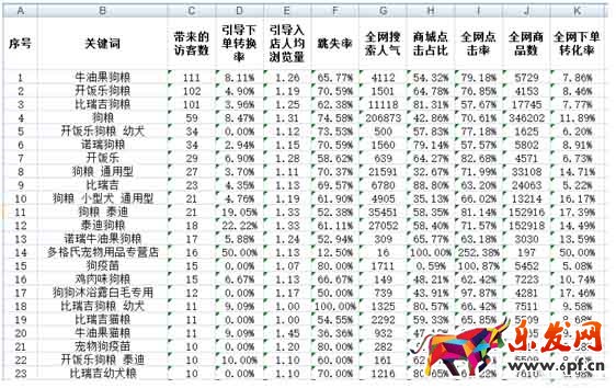 怎么來分析這些數據呢?我據其中的一個例子,然后大家可以多分析看看。我們看序號是“106”的這個詞“幼犬狗糧”,帶來的訪客數2個,跳失率0%,轉化率50%,全網搜索人氣也比較多,全網競爭力77還要多(這個數值跟所有值對比,差不多中等)。那這個詞怎么樣呢?