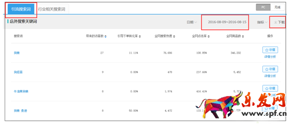 數據有PC端和無線端之分(PC端數據比無線端多了曝光量,可以考慮一下點擊率的問題),但是當前一般都是無線端數據是主流,所以我們以無線端為例。我們留下的數據包括:關鍵詞、訪客數、引導下單轉化率、人均瀏覽量、跳失率、全網搜索人氣、商城點擊占比、全網點擊率、全網商品數、全網下單轉化率。