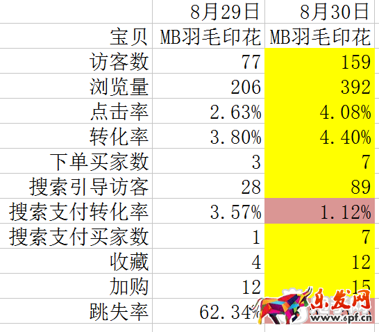 店鋪是從29號開始優化的,所以我這邊只列舉了這兩天的數據,大家可以看到30號黃色標記的各項指標都遠遠超出了29號,今天截止到寫稿為止,單品的訪客已經108,相信加上晚上的訪客差不多200單品訪客應該有了。