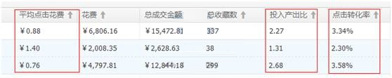 從ROI維度上看,投入產出比比較可觀,這個計劃的平均點擊花費相對于同行來說出價較低,點擊轉化率相對于同行來說較好。但是通過無線端和PC端數據的對比,PC端的平均點擊花費較高,點擊轉化率較少,導致投入產出比較低。PC端的數據對于計劃的整體數據拖后腿。所以我們首要調整的一點是,降低PC端的點擊花費,在保證有較好的展現位置的情況下,調低價格,減少平均點擊花費,其次是增大無線端投放比例,在有比較可觀的數據支撐,我們應該大膽的嘗試引進更多的流量。