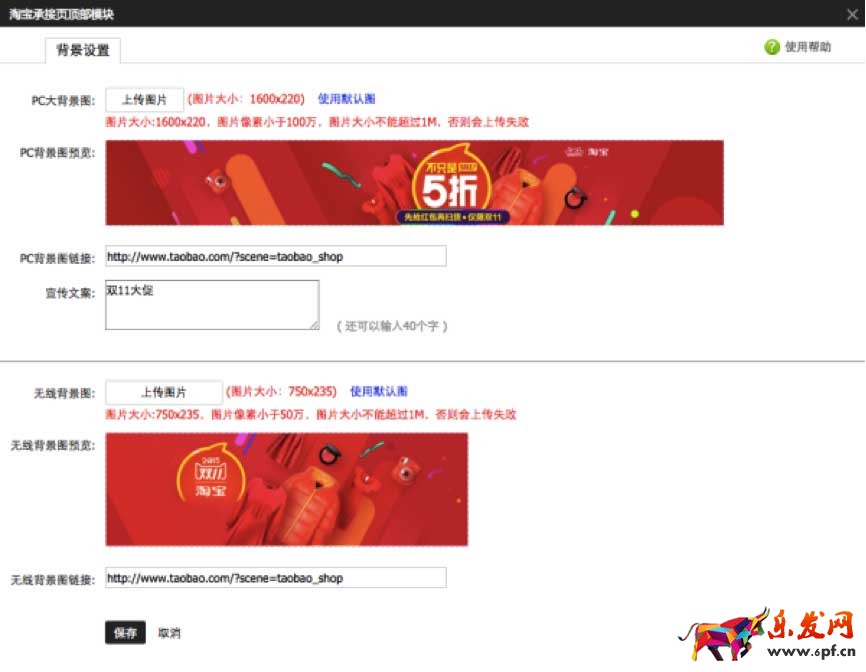 ②PC端“上傳圖片”上傳1600*220圖片,宣傳文案:系統提供默認版,可自行編輯45個字符,手淘端"上傳圖片”上傳750*235圖片。