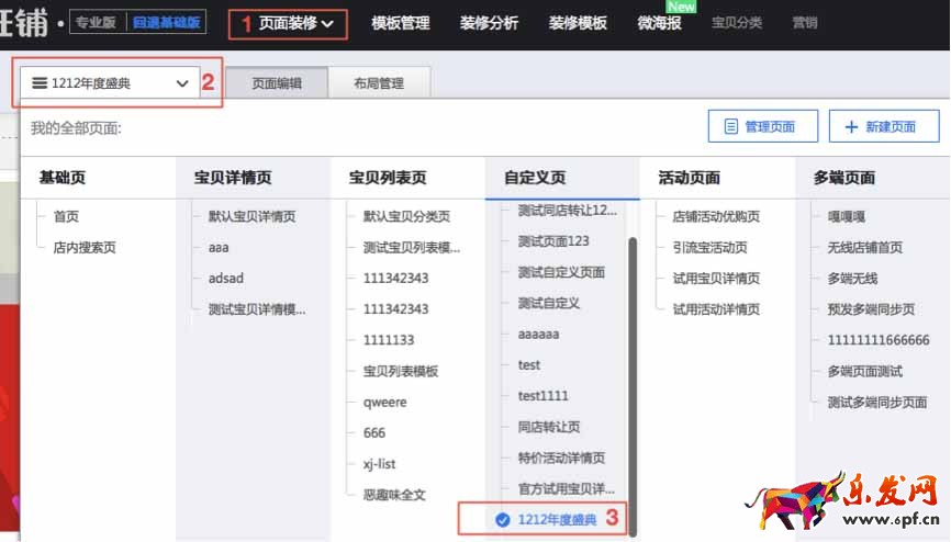 第一部:進入旺鋪裝修后臺,請點我~!→ 頁面裝修 → 點擊”頁面管理“ →自定義頁或官方預置頁 →”雙11活動承接頁“。