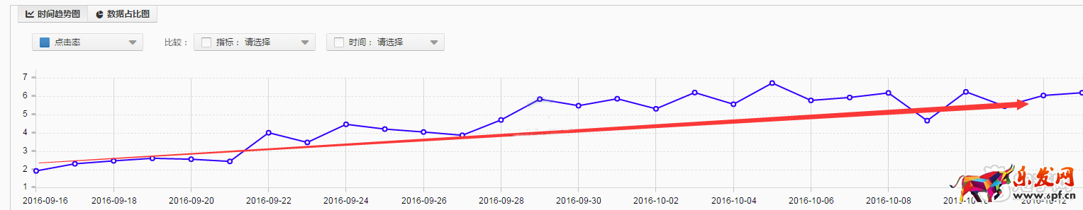 通過前期測圖找出點擊率最高的圖片后,把低點擊率的推廣圖換掉,同時寶貝的主圖也換成點擊率最高的圖片作為主圖。關鍵詞方面,對于展現量大點擊率低的,長尾詞降低出價觀察,大詞精準匹配,如果點擊率還是很低投產又不好的直接刪掉,避免拉低整個計劃的權重。如下圖:是一個男裝褲子,預算150元/天,點擊率的變化情況。