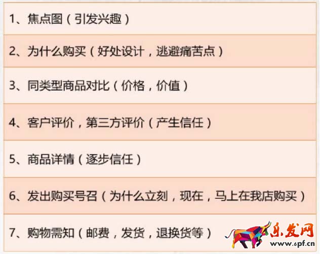 做主推商品詳情頁的時候我們首先需要做一張邏輯圖,理清我們需要添加的各種信息。這些信息的排列順序是要根據我們客戶的需求來的,不能總是按照淘寶官方給出的模板來做。拿下面這張邏輯圖舉例: