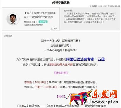 1、雙十一大促將至,各種活動源源不斷,淘寶為了幫助平臺賣家規避風險,特設【問答專場活動】,邀請阿里巴巴集團法務專家在【問商友】板塊就營銷活動等大促問題進行免費法務咨詢,有問題的商家們可前往提問。