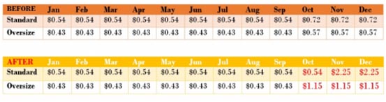 據了解,亞馬遜10月的倉儲費降低,但11月和12月費用將提高,為了抵消一部分影響,11-12月稱重處理費將降低。下圖為倉儲費變化: