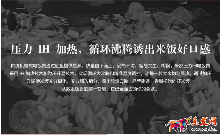 這是小米電飯煲的一個案例,這樣的圖片展現出來之后感覺圖片是在動的,效果是很好的,上面標題,下面是具體細節的文案展示,這張圖片在pc端上面的效果是非常好的。如果這個圖片放在手機詳情頁當中是什么樣的效果呢?大家仔細看下圖會發現,這段文字和標題它是直接引到了無線端當中,文字的信息量非常大,買家是不會仔細去閱讀的,而且文字把寶貝的主要細節擋住了,這種效果是大打折扣的,所以說強烈要求大家在手機端展現產品細節的時候,一定不要用文字把主要的產品的細節給遮擋住,這是一種不合理的安排。
