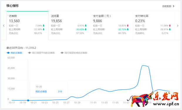 上面給大家截圖這家店和大家也一樣,雖然是個天貓店鋪,但是和死店也差不多,也沒錢,沒資源。但是就是這樣一個死店,就是這樣一個屌絲,完美逆襲,好糾結的劇情。11月15號的訪客是1萬3000多,雙11后面流量流量有點下滑,無顏見江東父老啊!